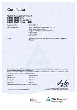 Par l'organisme de certification allemand TUV Rheinland ISO9001:2015, certification du système de gestion de la qualité double des dispositifs médicaux ISO13485.